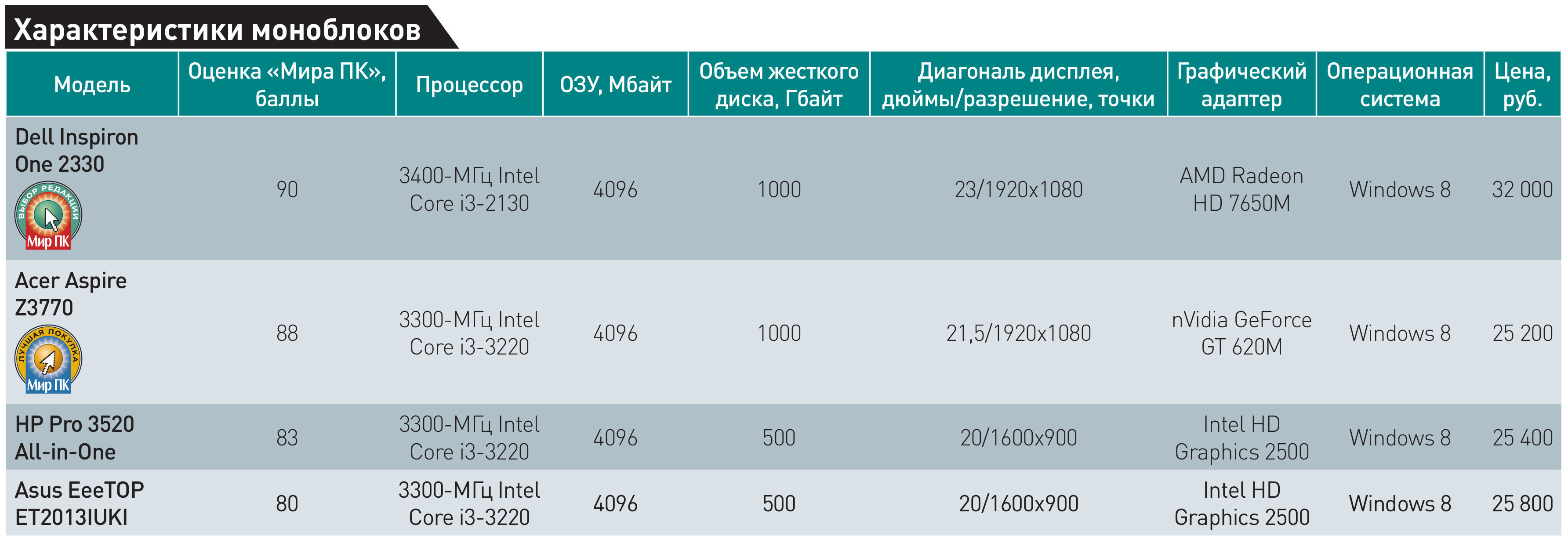 Рассмотрев четыре модели ведущих производителей, можно сделать выводы о том, что концепция ПК типа All in One во многих случаях вполне оправдана — они не занимают много места, удобны, практичны и в большинстве случаев способны украсить домашнюю гостиную, детскую или даже офисный стол преуспевающего бизнесмена. Что же касается наших предпочтений, то «Лучшей покупкой» мы выбрали модель Acer Aspire Z3770, тогда как «Выбор редакции» достался Dell Inspiron One 2320. Именно этот аппарат оказался наиболее интересным, обладающим отличными характеристиками при более чем демократичной цене.