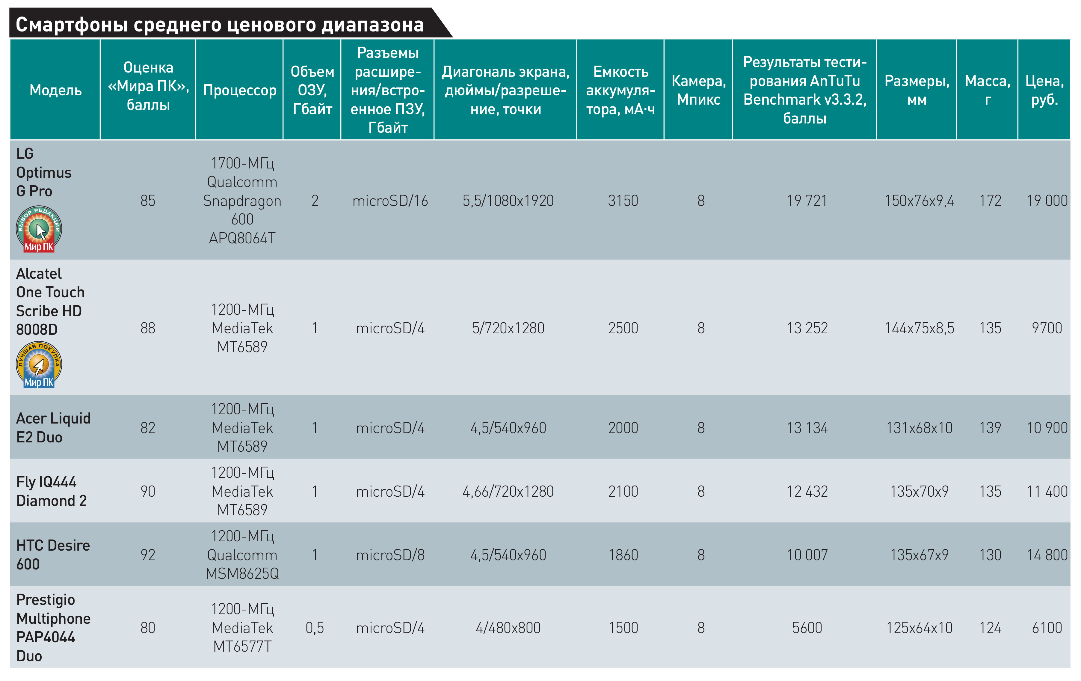 Рассмотрев шесть моделей смартфонов, представленных на российском рынке, мы пришли к выводу, что конкуренция в области подобных решений продолжает обостряться — снижаются цены, появляются новые модели, отличающиеся привлекательным дизайном и отличной функциональностью. Что же касается наших традиционных предпочтений, то «Выбором редакции» мы посчитали модель LG Optimus G Pro, тогда как «Лучшей покупкой» стал телефон Alcatel One Touch Scribe HD 8008D, обладающий более чем неплохими потребительскими качествами при демократичной цене.