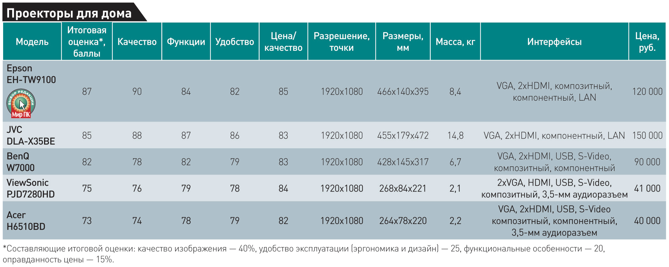 Среди рассмотренных моделей, на наш взгляд, наиболее предпочтительным решением для домашнего использования по качеству картинки является проектор Epson EH-TW9100 (значок «Выбор редакции»), хотя он и имеет высокую цену и определенные недостатки.