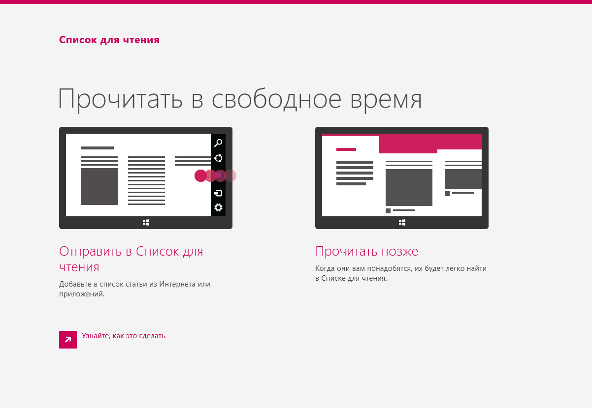 Не претендуя на полноценную замену программы Pocket или других средств сохранения информации для последующего автономного просмотра, приложение «Список для чтения» предлагает простой способ сохранения статей с целью их прочтения в более удобное для себя время. Много операций программа от вас не потребует. Информация в других приложениях (например, в Internet Explorer или «Новости») сохраняется с помощью элемента «Поделиться» на «чудо-панели».