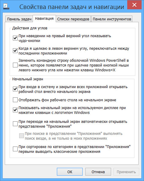 Щелкните правой кнопкой мыши на Панели задач, выберите из контекстного меню пункт «Свойства панели задач и навигации» и откройте новую вкладку «Навигация». Некоторые параметры, имеющиеся на этой вкладке, можно найти и в утилите «Параметры», но многие настройки начального экрана есть только здесь. Ну, а полезность их трудно переоценить! Хотите, чтобы после загрузки ОС перед вами появлялся Рабочий стол или экран «Приложения»? Пожалуйста.