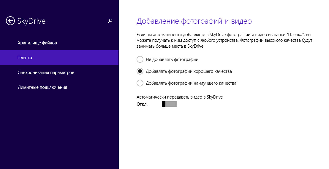 Откройте «чудо-панель» и выберите пункт «Параметры», а затем «Изменение параметров компьютера». Откройте параметры SkyDrive и выберите на левой панели меню пункт «Пленка». Здесь вы можете указать, что фотографии и видео по умолчанию будут сохраняться в SkyDrive — отличная возможность для того, кто хочет чувствовать себя в своей привычной среде за любым компьютером с операционной системой Windows 8.