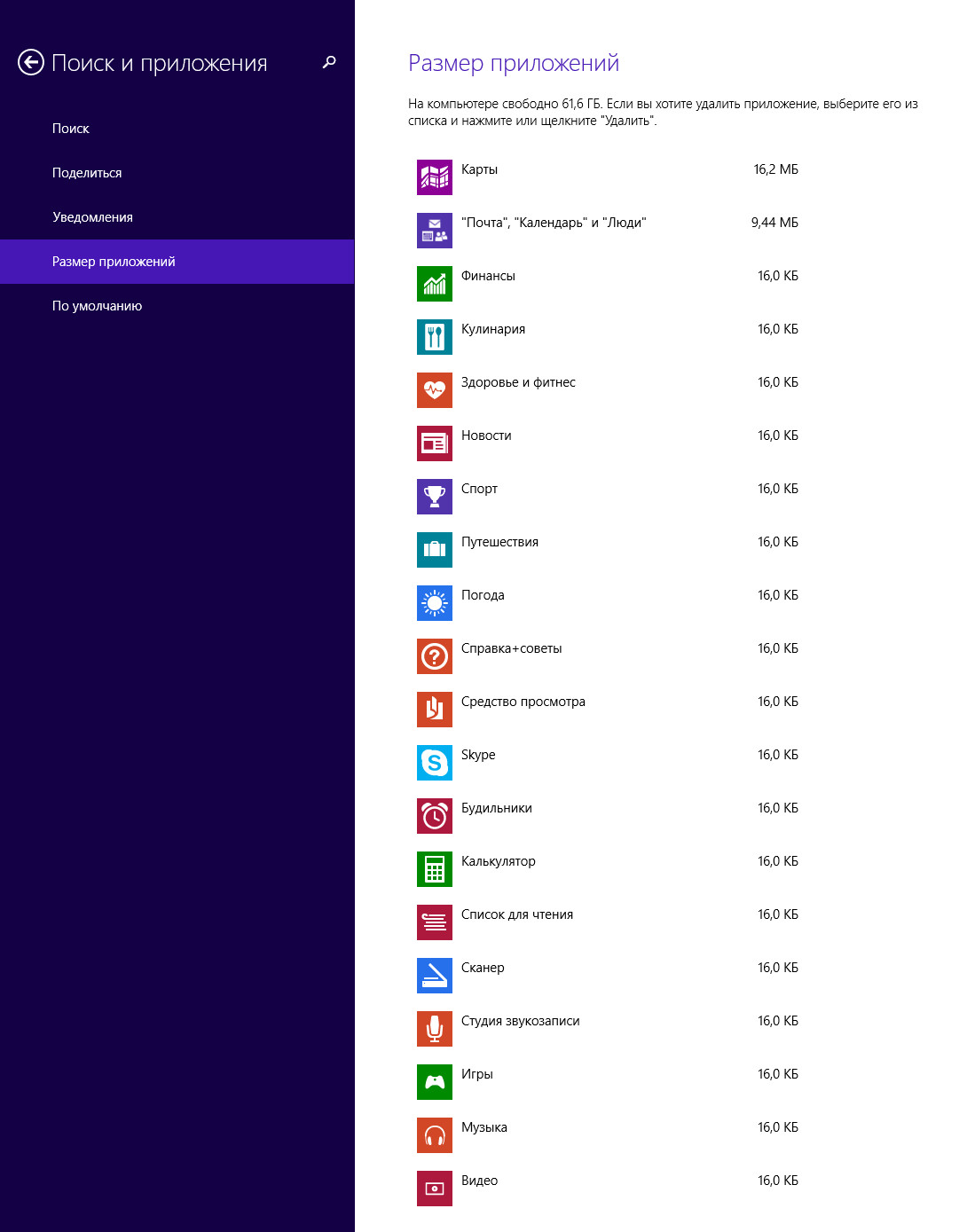 Система Windows 8.1 видоизменяет раздел «Поиск и приложения», добавляя в левое меню пункт «Размер приложений». На экране отображается полный список всех установленных современных приложений, дополняемый размерами файла каждого из приложений. Если вы хотите освободить место на жестком диске, просто щелкните на приложении мышью и перейдите к его деинсталляции