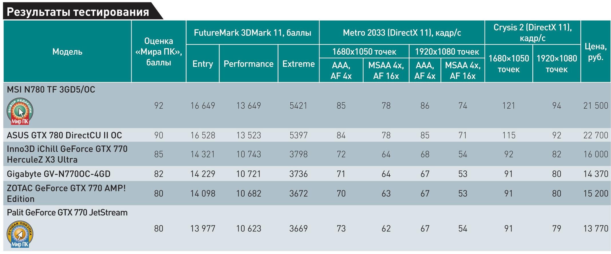 Тестирование завершено, пора подвести итоги. На сей раз значок «Лучшая покупка» по праву заслужила видеокарта Palit GeForce GTX 770 JetStream, поскольку она имеет отличное соотношение цена/производительность. А вот выбором редакции стала модель MSI N780 TF 3GD5/OC — на наш взгляд, она является наиболее оптимальной для тех, кто пытается «выжать» из видеокарты все, на что она способна.