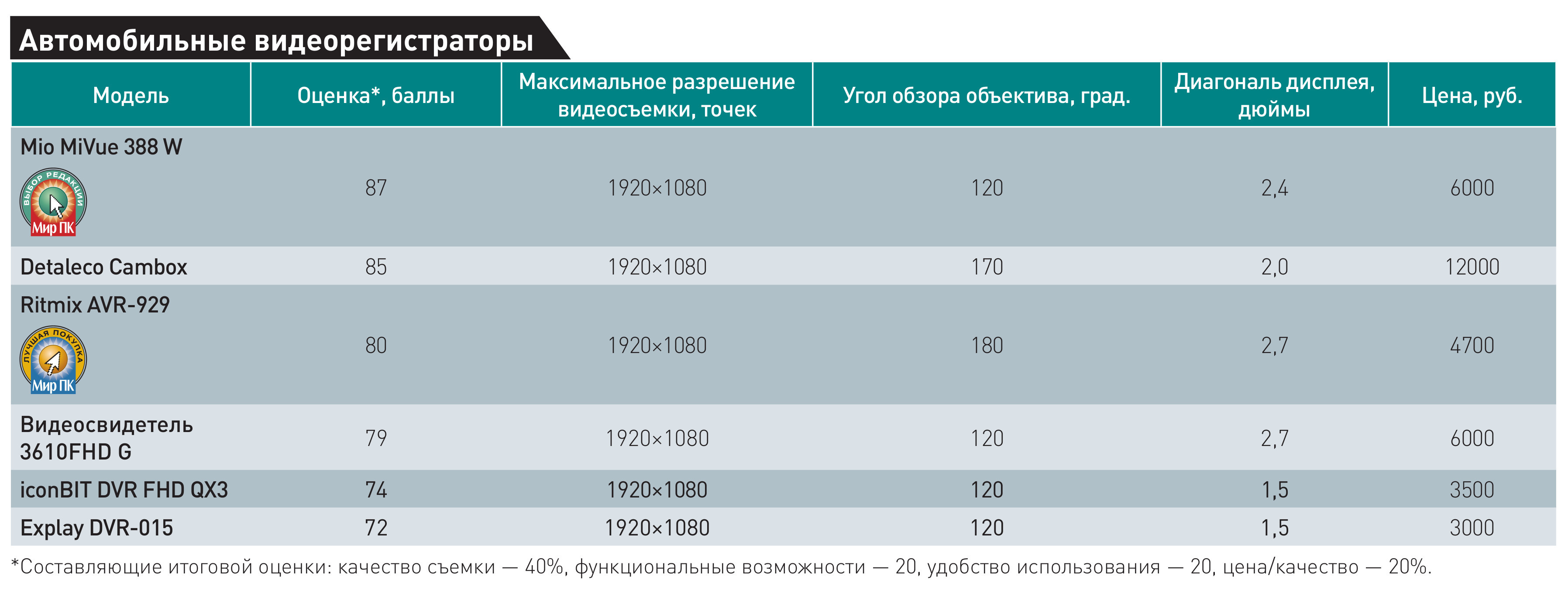 Как показал наш обзор, среди рассмотренных устройств наиболее качественную картинку выдает аппарат Mio MiVue 388 W, ему-то и достался значок «Выбор редакции». А оптимальным соотношением цена/качество обладает модель Ritmix AVR-929 — ее награда «Лучшая покупка». Обязательно посмотрите примеры видео на диске «Мира ПК»