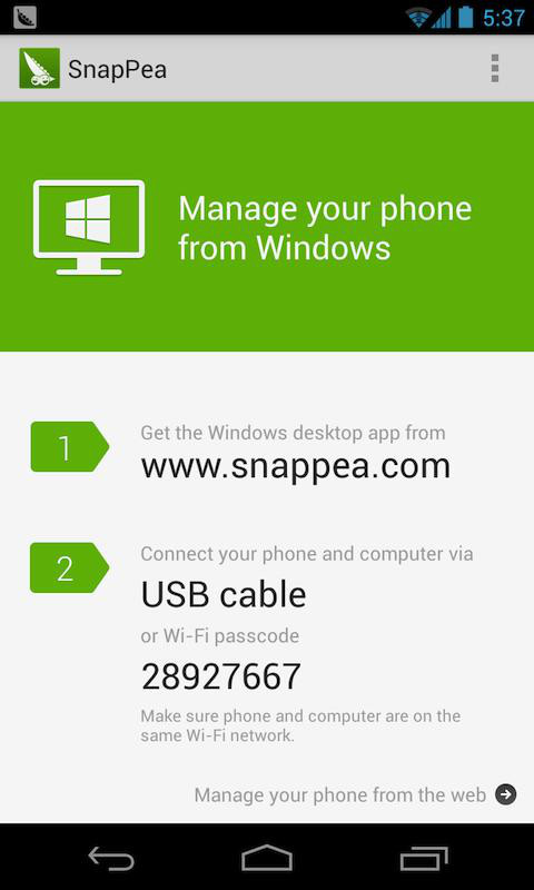 Программа SnapPea (go.pcworld.com/snappea) перемещает файлы (фотографии, музыку, видео и т.д.) между компьютером и телефоном. Кроме того, она позволяет управлять телефоном на базе Android с компьютера, используя либо веб-браузер, либо загружаемое настольное приложение.