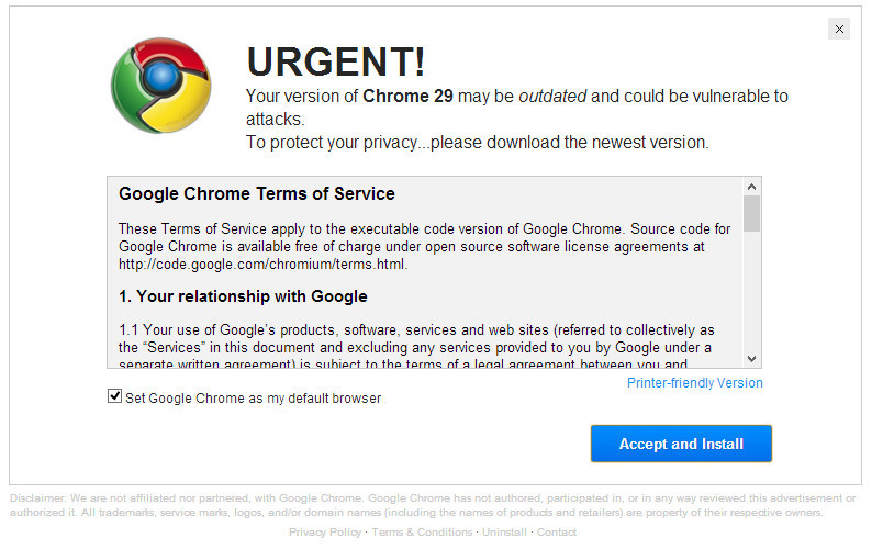 Коварные сайты маскируют установку рекламных программ под запросы на обновление браузера или утверждения о том, что для полноценного просмотра веб-страницы вам следует установить самую последнюю версию программного обеспечения. Щелчок по любой кнопке (даже по кнопке отказа) позволяет атакующему запустить на вашей машине нужный ему код или перейти на страницу загрузки вредоносной программы, замаскированную под установку Flash, QuickTime или чего-то еще. Вот вы и попались.