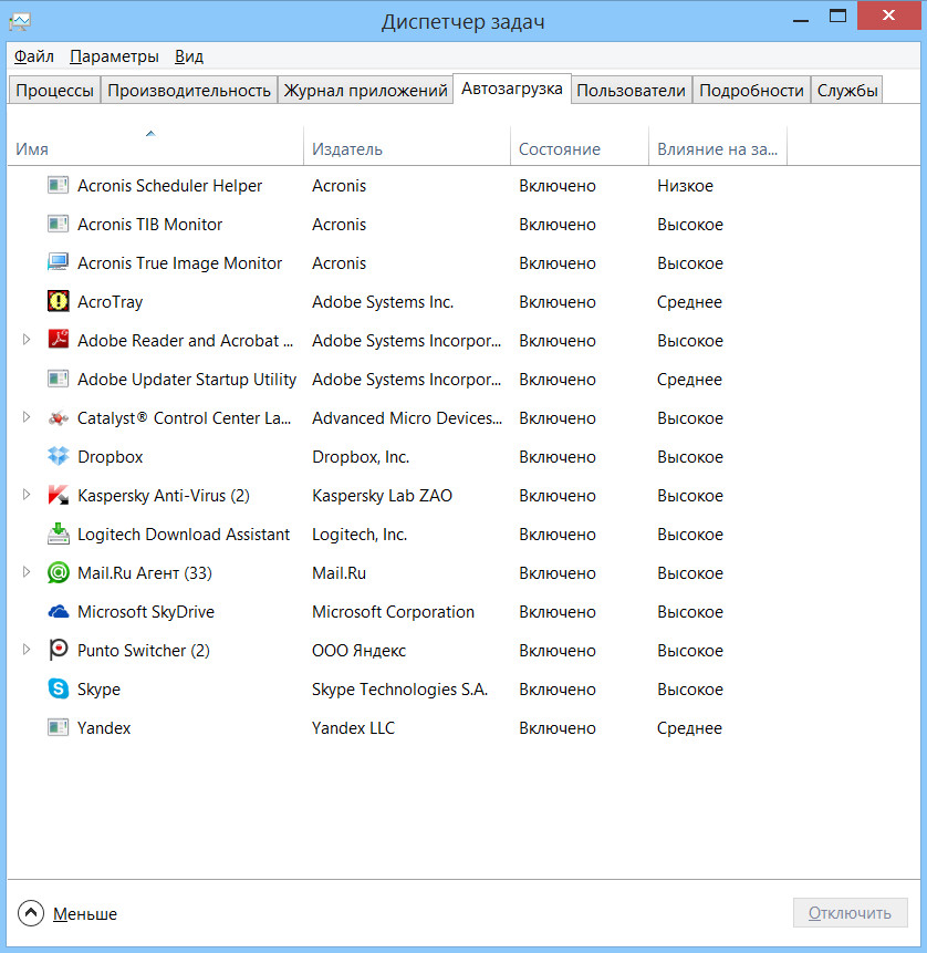 | Диспетчер задач Windows 8 показывает перечень программ, которые запускаются в момент начальной загрузки системы |