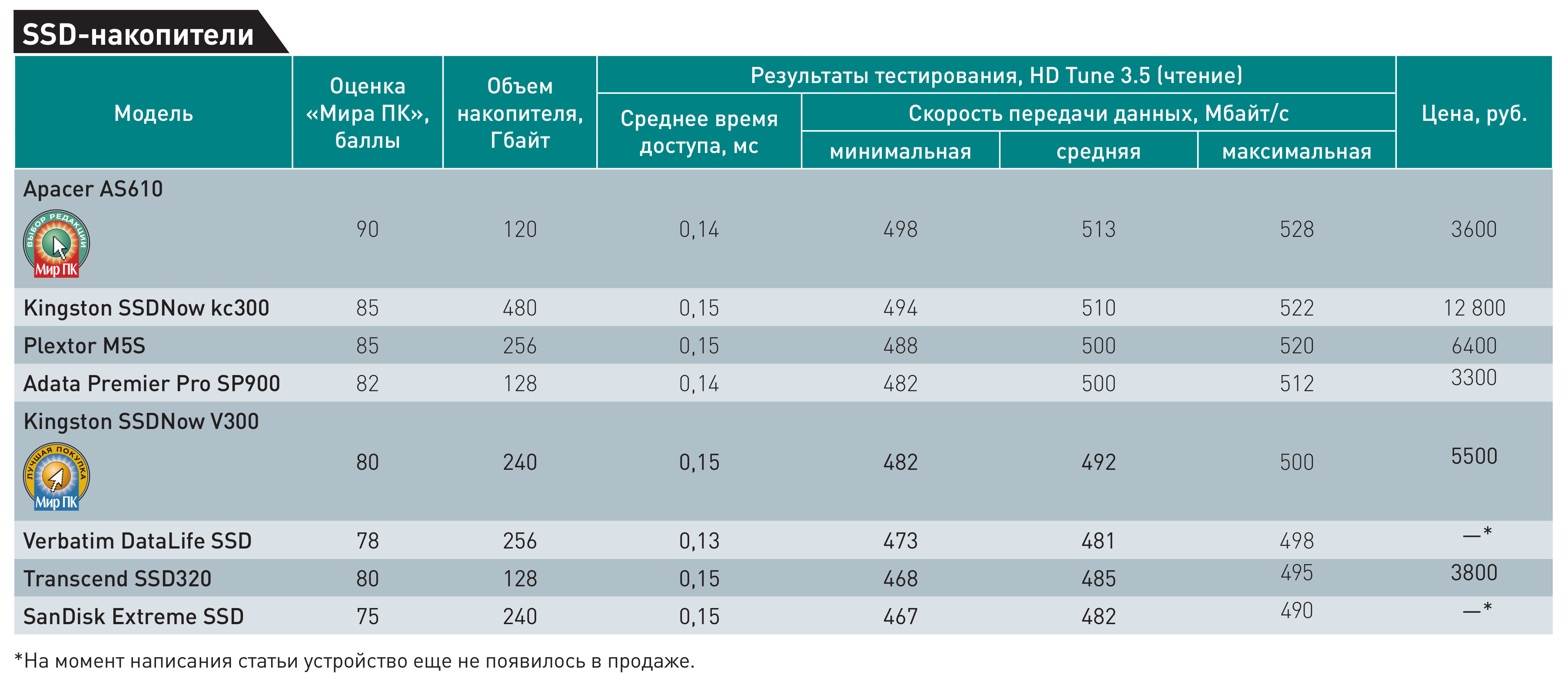 По итогам наших испытаний «Выбор редакции» пал на SSD-диск Apacer AS610, обладающий отличными скоростными показателями, тогда как «Лучшей покупкой» мы посчитали Kingston SSDNow V300, который имеет минимальную стоимость единицы хранения информации.