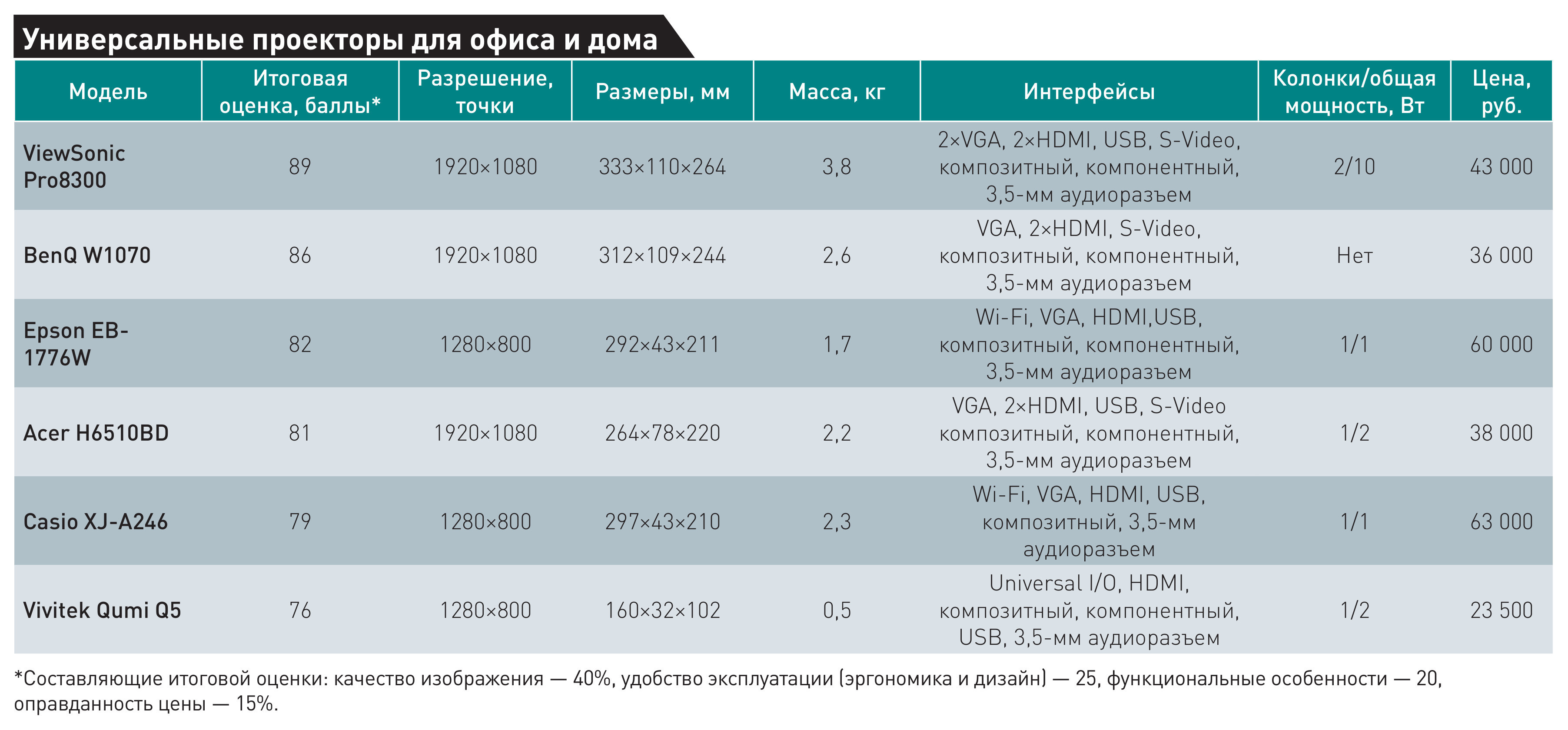 Почти все представленные в этом обзоре проекторы обеспечивают картинку хорошего качества не только при офисном использовании, но и в домашнем обиходе, благодаря чему их, несомненно, можно назвать универсальными. Как показали испытания, лучшей по выводу видеопотока среди представленных моделей мы сочли ViewSonic Pro8300. Если же важны портативность и стоимость, то достойным выбором будет устройство Vivitek Qumi Q5.