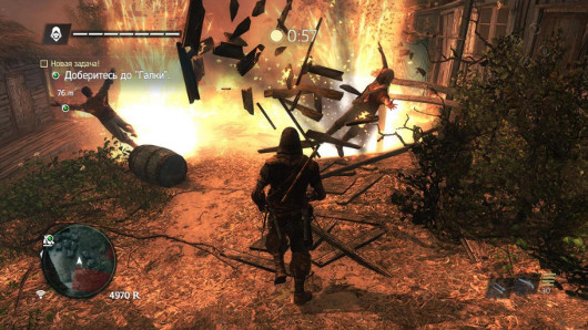 Впрочем, разве кто-то покупает Assassin’s Creed ради сюжета?! Две вводных миссии пролетают со скоростью пули из пиратского мушкета, а перед началом третьей главный герой получает корабль, свободный доступ к карте,.. и сценарий просто тонет в огромном мире игры, словно ядрами продырявленный! Неспешно плывут по своим делам торговцы, гоняются друг за другом испанские и британские эскадры, на берегу едва ли не каждый второй припас для вас какое-нибудь поручение, в общем, всюду кипит жизнь. Тамплиеры? Ассасины? «Нет, не слышали!», — как будто говорим мы разработчикам. Кому интересна вся эта выморочная теория заговора, если «Галка» (название корабля Кенуэя) не прокачана полностью?