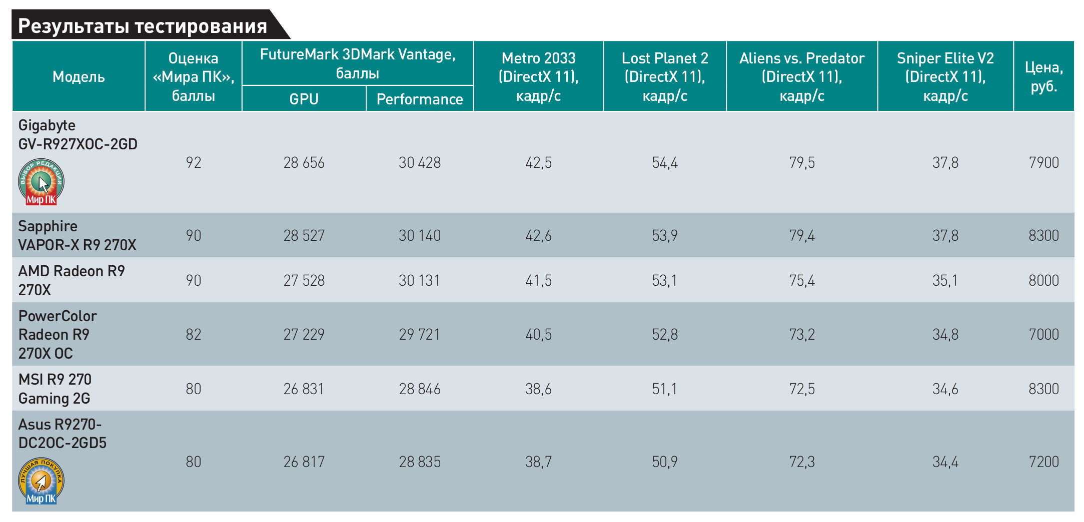 Тестирование завершено, пора подвести итоги. На сей раз значок «Лучшая покупка» по праву заслужила видеокарта Asus R9270-DC2OC-2GD5, имеющая отличное соотношение цена/производительность. А вот выбором редакции стала модель Gigabyte GV-R927XOC-2GD — на наш взгляд, она является наиболее оптимальным выбором для тех, кто пытается «выжать» из видеокарты все, на что она способна.
