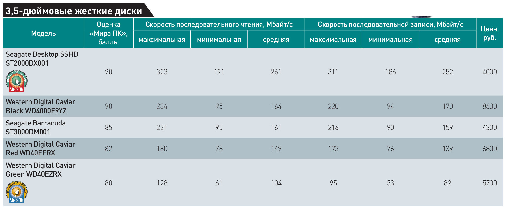 Подводя итоги нашего тестирования, нужно признать, что все рассмотренные нами накопители действительно способны обеспечить надежное хранение и быстрое перемещение пользовательских данных. Что же касается наших предпочтений, то на сей раз «Выбор редакции» достается накопителю Seagate Desktop SSHD ST2000DX001, а вот «Лучшей покупкой» мы посчитали Western Digital Caviar Green WD40EZRX — несмотря на не самую высокую скорость передачи данных, это устройство оказалось наиболее привлекательным по стоимости хранения информации.
