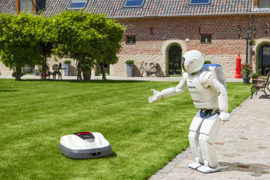 | Знаменитый робот-андроид Honda Asimo рекламирует робота-газонокосилку Honda Miimo |