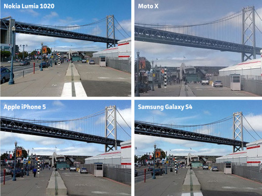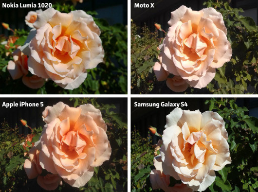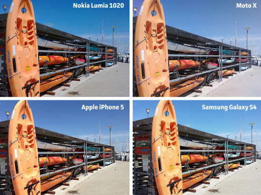 В нашем обзоре мы решили сравнить показатели камер Nokia Lumia 1020 и Moto X с результатами, демонстрируемыми устройствами iPhone 5 и Samsung Galaxy S4. Модель Lumia 1020, работающая под управлением операционной системы Windows Phone, отличается мощной камерой с разрешением 41 Мпикс — самым большим в классе смартфонов, а 10-Мпикс камера Moto X оснащена матрицей RGBC, у которой к трем стандартным (RGB) добавлен четвертый пиксел, улучшающий результаты съемки в условиях низкой освещенности. Качество снимков, в общем-то, соответствует тому, которое приводится в обзорах, и, сравнив фотографии, сделанные разными камерами, вы сами можете сделать выводы.