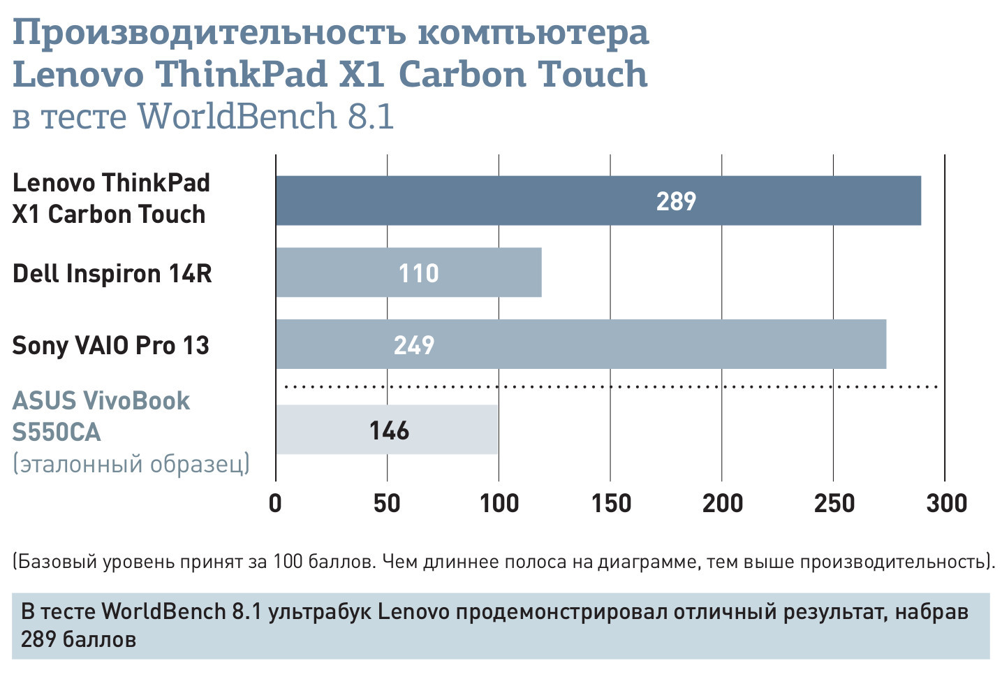 | Благодаря сверхбыстрому твердотельному накопителю, модель X1 Carbon Touch набрала 289 баллов в тесте WorldBench 8.1 |