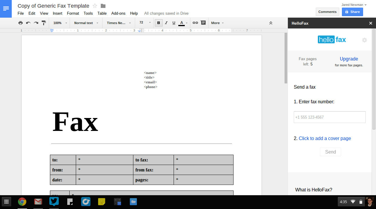 В тех редких случаях (хочется в это верить), когда вам нужно отправить факс, предлагаемый способ поможет избежать похода на почту. Расширение Hello Fax позволяет отправлять документы по факсу непосредственно из «Документов Google». Здесь есть даже встроенная форма для оформления. Правда, бесплатно сервис позволяет отправить только пять страниц. Отправка последующих обойдется вам в 99 центов за лист. Можно также оформить подписку, стоимость которой составляет от 10 долл. в месяц.