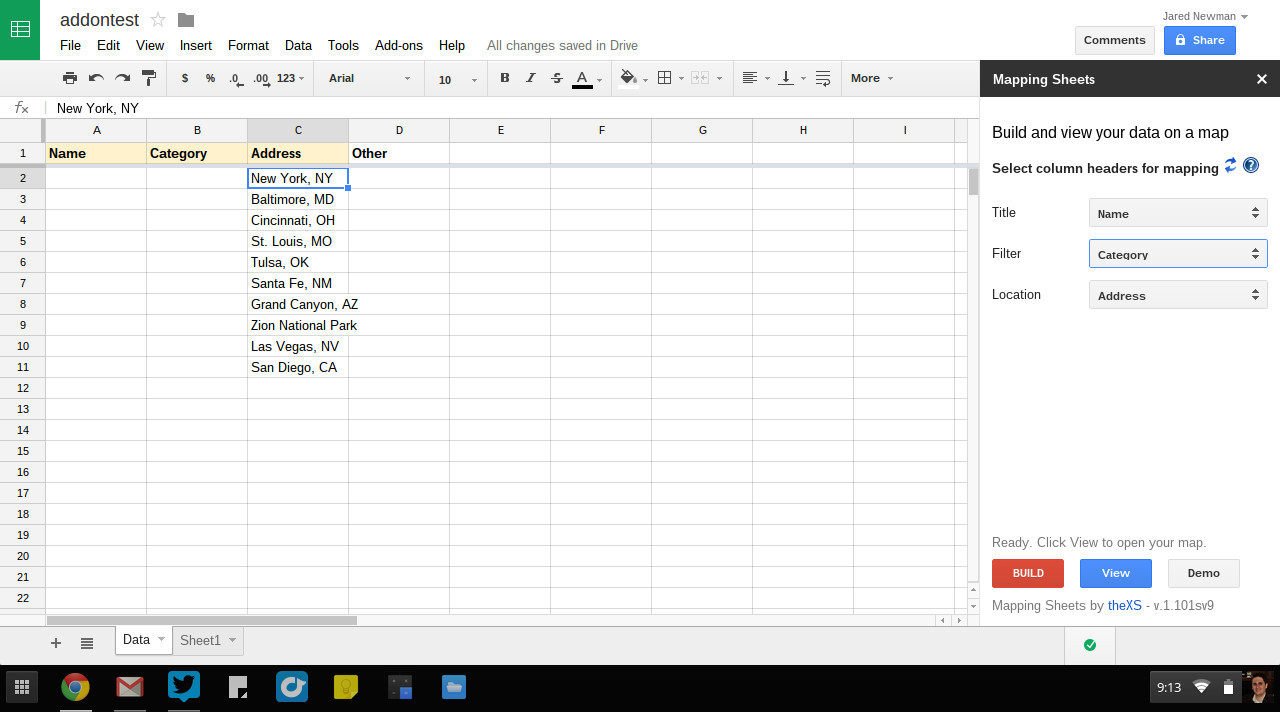 Расширение Mapping Sheets отображает на «Картах Google» выбранный список адресов. Данные на карте можно фильтровать по категориям, как указано в электронной таблице. На первый взгляд, этот инструмент кажется не особенно полезным, но ему можно придумать множество потенциальных применений, начиная от демонстрации на карте оптимального маршрута доставки и заканчивая графическим представлением всех мест, где вам довелось побывать.