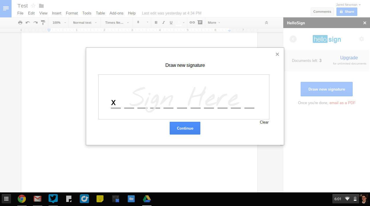 Диск Google предлагает несколько способов создания электронной подписи, самым простым из которых является расширение Hello Sign. Нарисуйте свой автограф в поле, предназначенном для ввода подписи, и просто перетащите его в «Документ Google». Если вы занимаетесь сбором подписей, можно добавить соответствующее поле к документу на сайте Hello Sign и отправить его по электронной почте. Бесплатно в течение месяца разрешается вставить подписи в три документа. За 15 долл. в месяц это ограничение снимается.