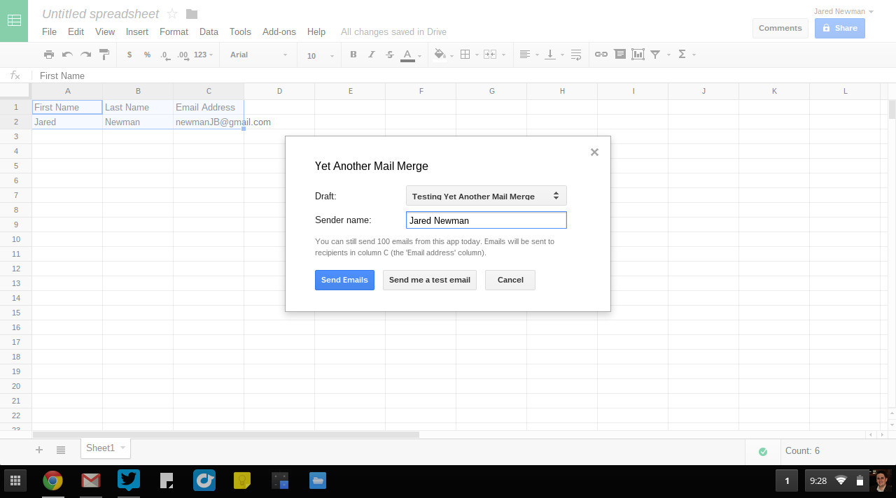 С помощью расширения Yet Another Mail Merge вы сможете генерировать формы писем из электронной таблицы и управлять электронной почтой. После вставки в сообщение Gmail специальных синтаксических конструкций пользователь обращается к соответствующему расширению в «Таблицах Google», выбирает нужное сообщение и отправляет его по электронной почте. Совсем уж интуитивно понятным это расширение не назовешь, но встроенная система помощи упрощает решение стоящих перед вами задач. Yet Another Mail Merge позволяет отправлять 99 сообщений в день, чего должно быть вполне достаточно.