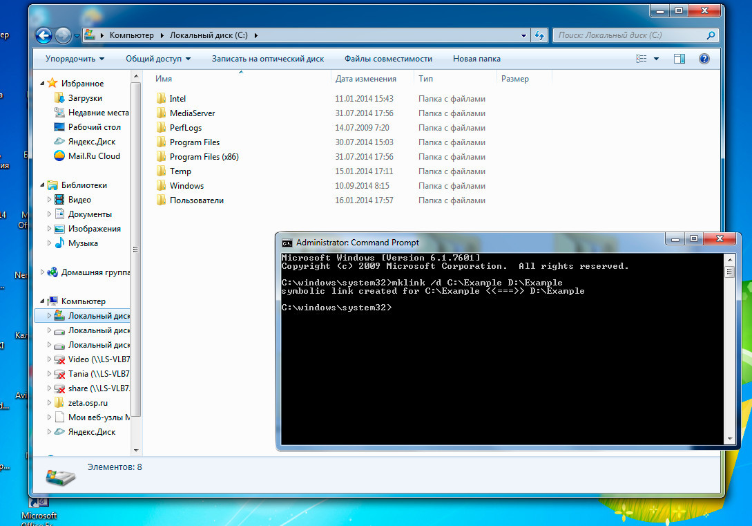 | Указанная команда создает для папки Example символическую ссылку. После этого все обращения к C:Example будут автоматически переадресовываться на D:Example |