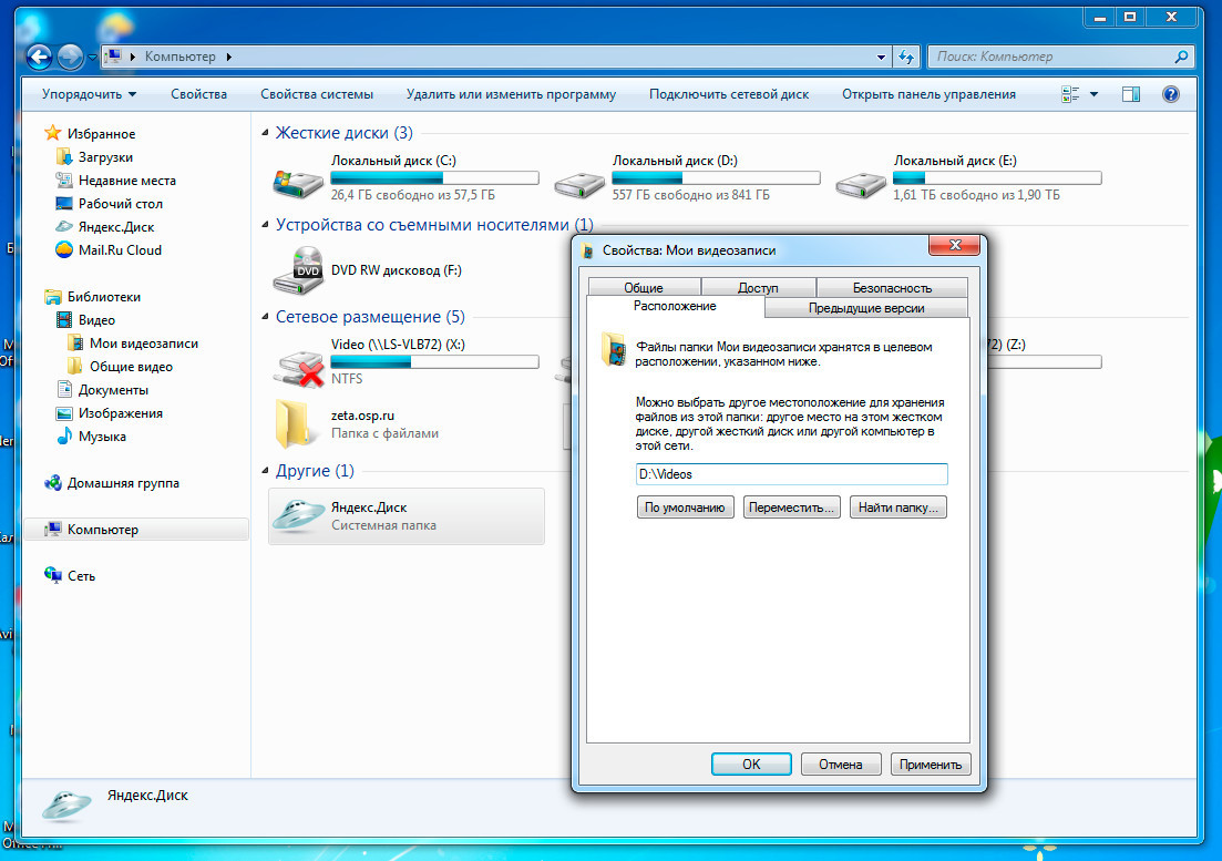 При необходимости вы можете легко переместить папки со своими пользовательскими данными. Например, для того чтобы перенести папку Videos с главного системного накопителя (устройства SSD) на второй диск (механический), найдите папку Videos в папке C:Usersваше-имя-пользователя. Щелкните на ней правой кнопкой мыши, выберите в контекстном меню пункт «Свойства», перейдите на вкладку «Расположение» и укажите там новое место. Вы по-прежнему будете видеть папку C:Usersваше-имя-пользователяVideos, и эта папка будет отображаться в библиотеке «Видео», однако ее содержимое будет находиться уже на другом диске. То же самое можно проделать с папками Music, Pictures, Documents и Downloads.
