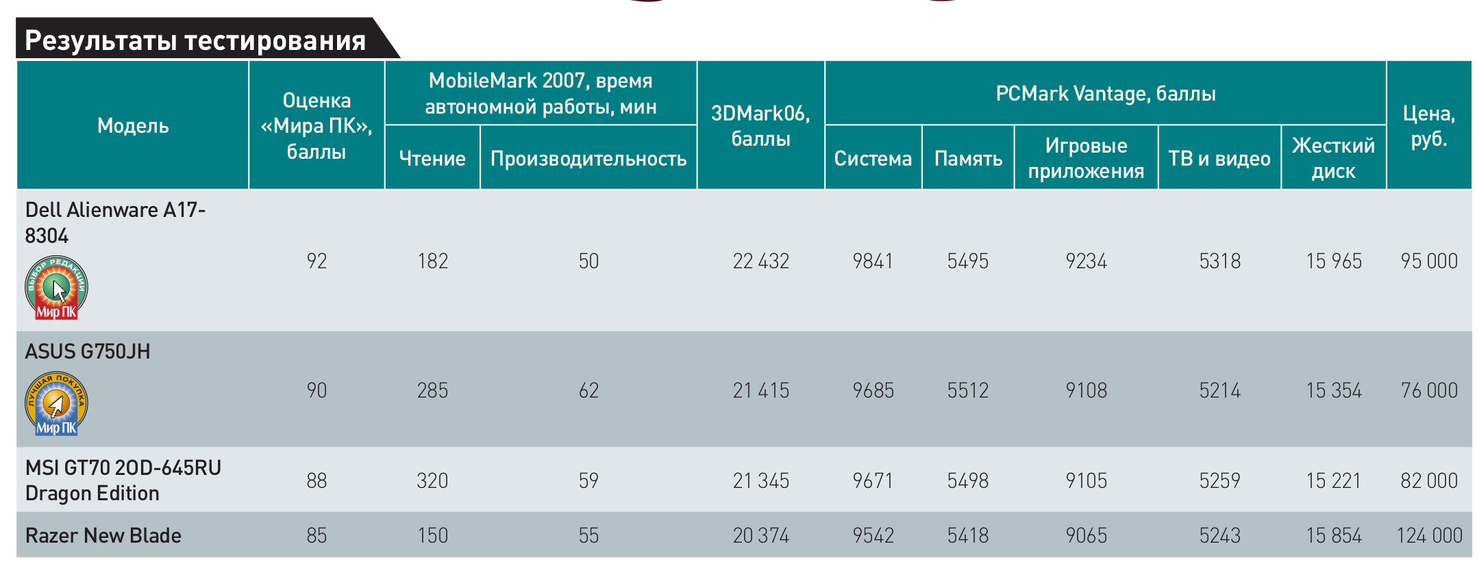 По результатам нашего исследования мы выделили модель Dell Alienware A17-8304, в которой наиболее удачно сочетаются высокая производительность и даже некая портативность, и потому она по праву заслужила награду «Выбор редакции». А вот «Лучшей покупкой» мы посчитали ASUS G750JH — на наш взгляд, именно этот ноутбук обладает оптимальным соотношением цена/функциональность.