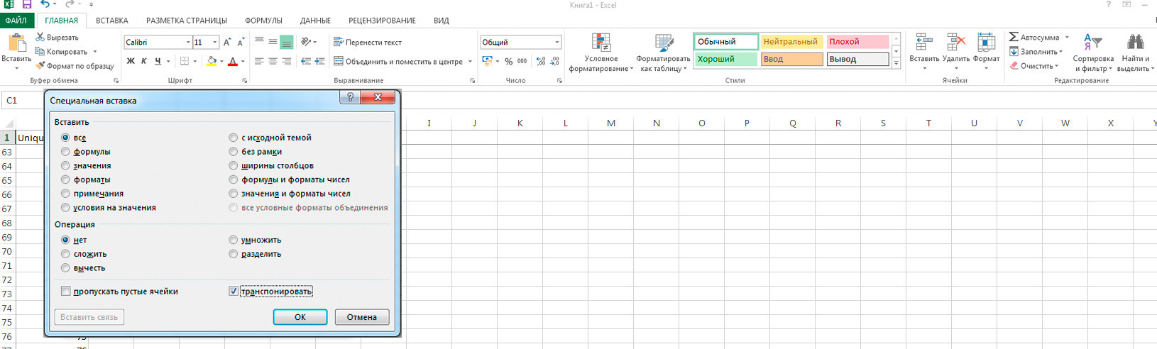 Иногда возникает потребность поменять в таблице местами строки и столбцы. Чтобы проделать это, скопируйте нужную область в буфер обмена, щелкните правой кнопкой мыши на левой верхней ячейке той области, в которую осуществляется вставка, и выберите в контекстном меню пункт «Специальная вставка». В появившемся на экране окне установите флажок «Транспонировать» и нажмите OK. Все остальное за вас сделает Excel.