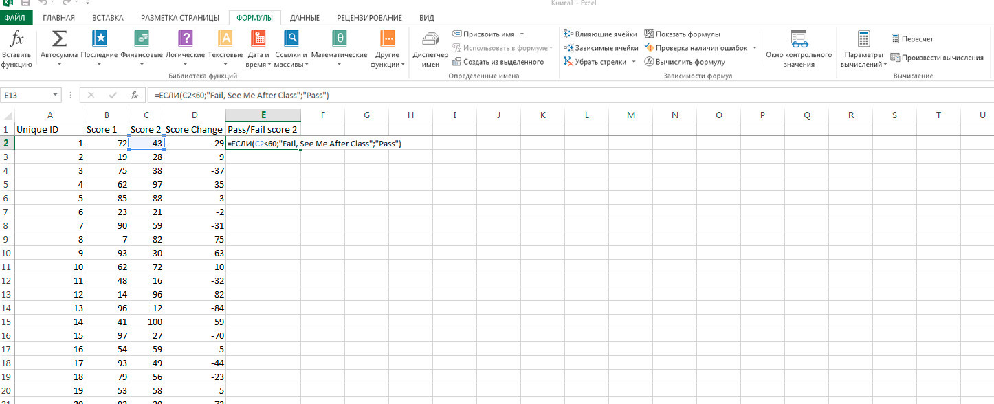К числу наиболее популярных функций Excel относятся ЕСЛИ и ЕСЛИОШИБКА. Функция ЕСЛИ позволяет определить условную формулу, которая при выполнении условия вычисляет одно значение, а при его невыполнении — другое. Например, студентам, получившим за экзамен 80 баллов и больше (оценки выставлены в столбце C), можно присвоить признак «Сдал», а тем, кто получил 79 баллов и меньше, — признак «Не сдал».
