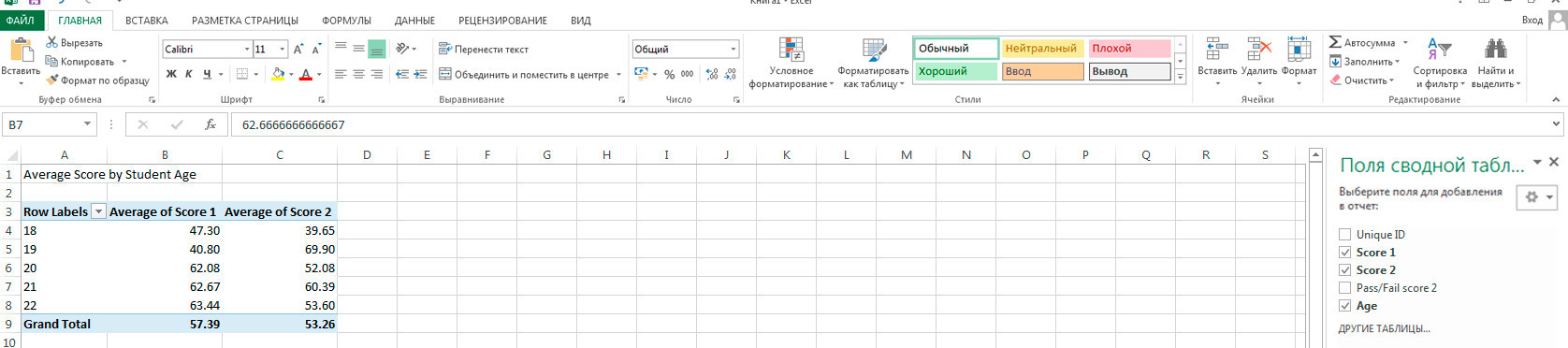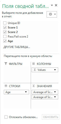 Например, чтобы подсчитать средний балл студентов в зависимости от их возраста, переместите поле «Возраст» в раздел Строки (1), а поля с оценками — в раздел «Значения» (2). В меню значений выберите пункт «Параметры полей значений» и в качестве операции укажите «Среднее» (3). Таким же образом можно подсчитывать итоги и по другим категориям, например, вычислять число сдавших и не сдавших экзамен в зависимости от пола.