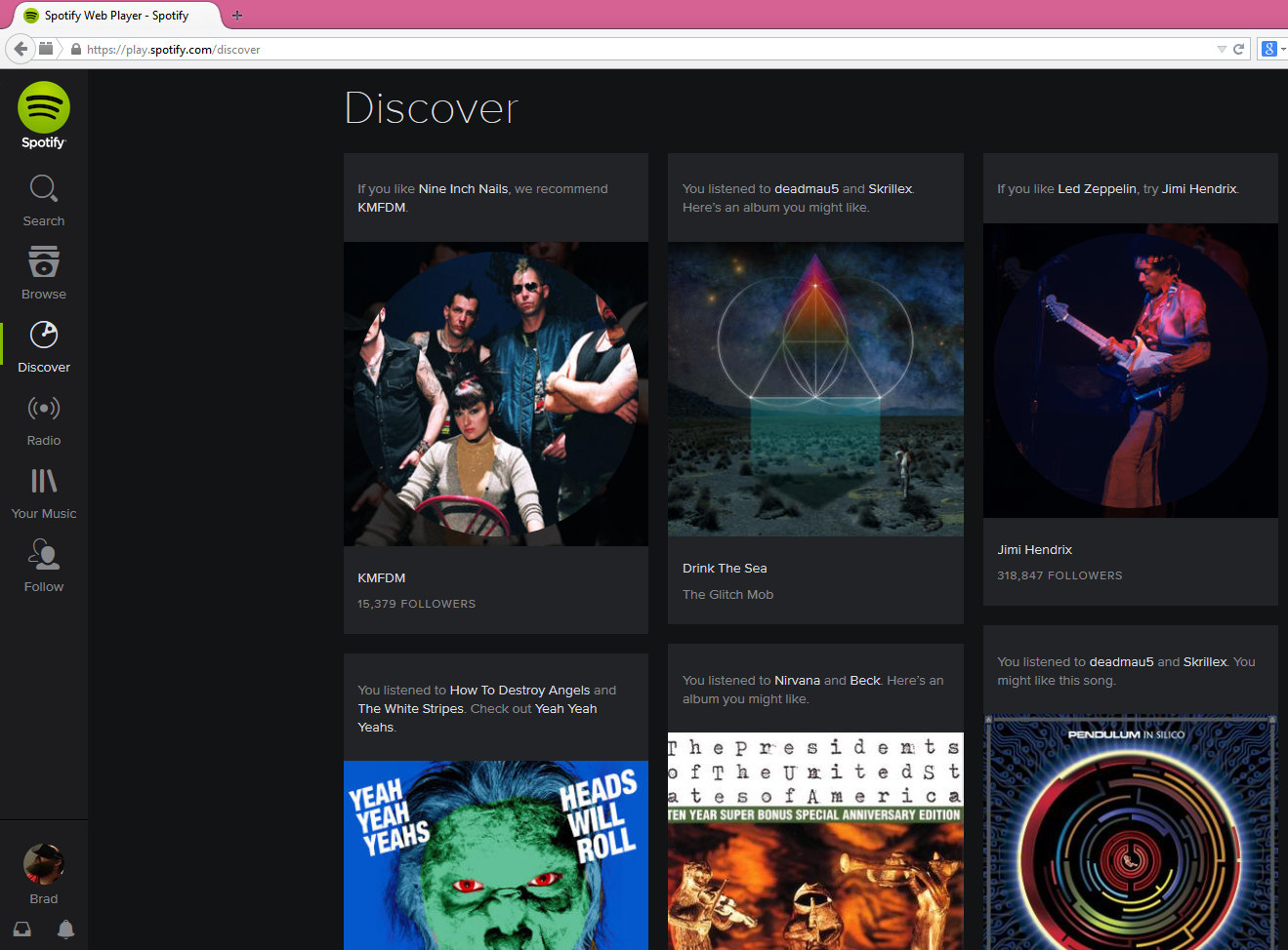 Откройте клиентскую част Spotify. Этот веб-сервис потоковой музыки предоставляет доступ более чем к 20 млн песен, причем делает это совершенно бесплатно, если вы согласны слушать рекламу. Заплатив 10 долл. в месяц, вы избавитесь от рекламы, получите доступ к записям более высокого качества и возможность прослушивания в автономном режиме. Функции Spotify Discover, Browse и Radio помогают знакомиться с новой музыкой.