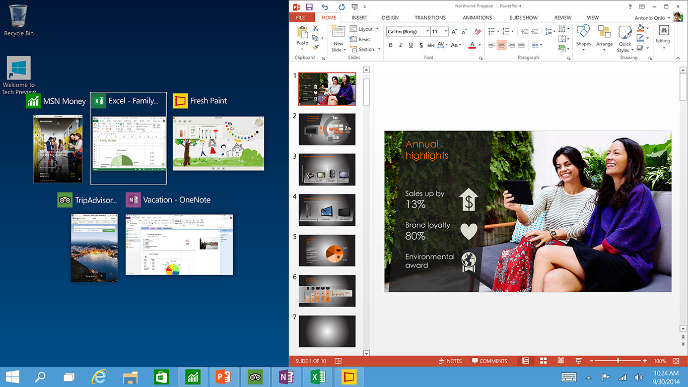 Можно заметить, что целый ряд функций — Snap Assist, приложения в окнах, виртуальные Рабочие столы — органично дополняют друг друга. Интересно было бы поэкспериментировать с ними и посмотреть, что нового они привнесут в мою повседневную деятельность.
