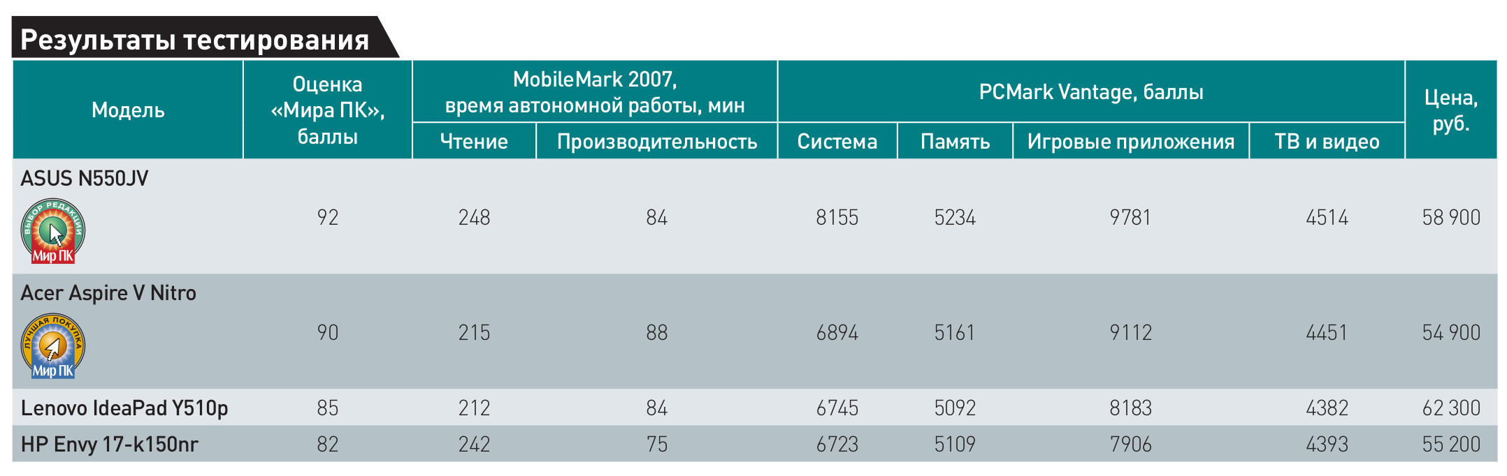 Что же касается наших предпочтений, то «Лучшей покупкой» мы выбрали модель Acer Aspire V Nitro, тогда как «Выбор редакции» достался ноутбуку ASUS N550JV. Именно этот аппарат оказался наиболее совершенным устройством, обладающим отличными характеристиками и неплохой функциональностью.