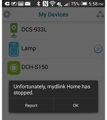 В уведомлении говорилось, что если я хочу получить подробный отчет об ошибке, мне следует отправить сообщение с разъяснением того, что случилось. К счастью, после перезапуска приложение сумело обнаружить Smart Plug, и почти все стало работать, как надо. Единственный недостаток заключался в том, что при попытке дотронуться до значка IP-камеры D-Link DCS-933L, которая также является частью системы, программа завершалась аварийно.