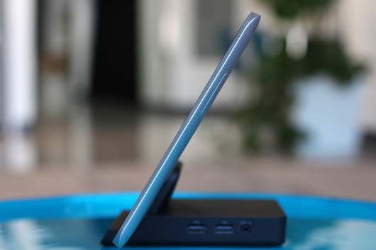 | На фоне стыковочной станции хорошо видно, что модель ElitePad 1000 G2 действительно очень тонкая для планшета, работающего под управлением Windows 8.1 |