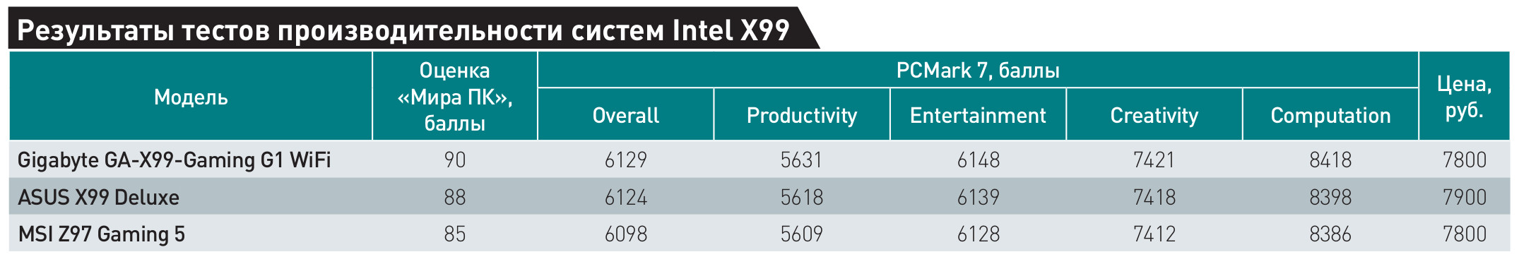 Так стоит ли платить больше? Вопрос непростой, хотя любой завзятый оверклокер ответит на него без колебаний. Тем не менее, на наш взгляд, применение плат на основе Intel X99 для построения домашнего игрового ПК выглядит неоправданным — особых преимуществ в реальном использовании такая конфигурация не даст. Впрочем, время не стоит на месте, и, может быть, очень скоро новые игры действительно потребуют гигантских объемов памяти и восьмиядерных процессоров. Поживем — увидим.