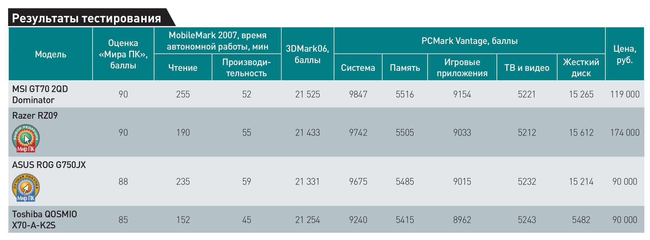 Среди рассмотренных аппаратов мы решили выделить модель Razer RZ09: в ней наиболее удачно сочетаются высокая производительность и портативность, поэтому данное устройство по праву заслуживает награду «Выбор редакции». А вот «Лучшей покупкой» мы посчитали ASUS ROG G750JX — на наш взгляд, именно этот ноутбук обладает оптимальным соотношением цена/функциональность.