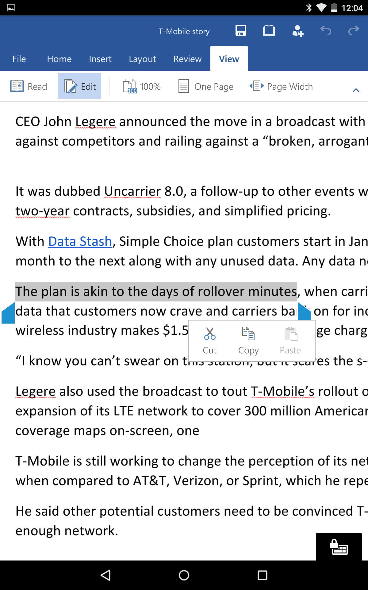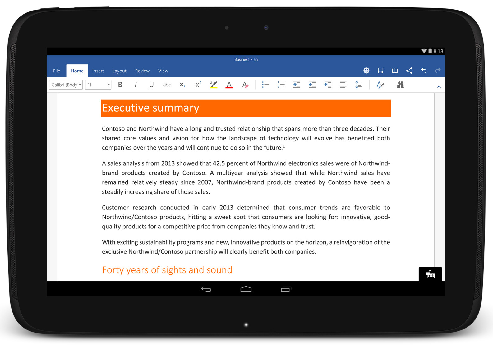 Мне довелось познакомиться с окончательными сборками еще до их официального появления. Несмотря на то что никаких радикальных изменений не произошло, Microsoft удалось создать достаточно зрелый и интересный офисный пакет, который вполне способен нарушить доминирующее положение, занимаемое в среде Android офисными приложениями Google (Docs, Sheets и Slides).