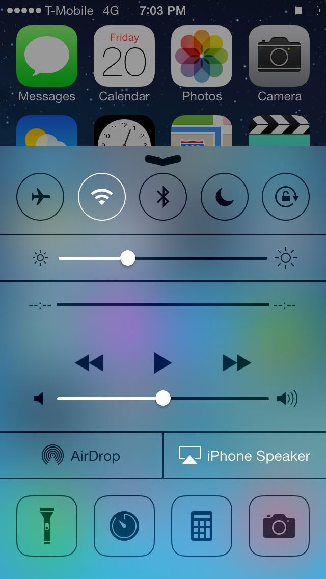 Начиная с iOS 7 устройства iPhone и iPad поставляются с Control Center — удобным выдвигающимся окном, которое обеспечивает быстрый доступ к настройкам Wi-Fi и сотовых сетей, элементам управления мультимедийными функциями, будильникам и таймерам, а также к камере.
