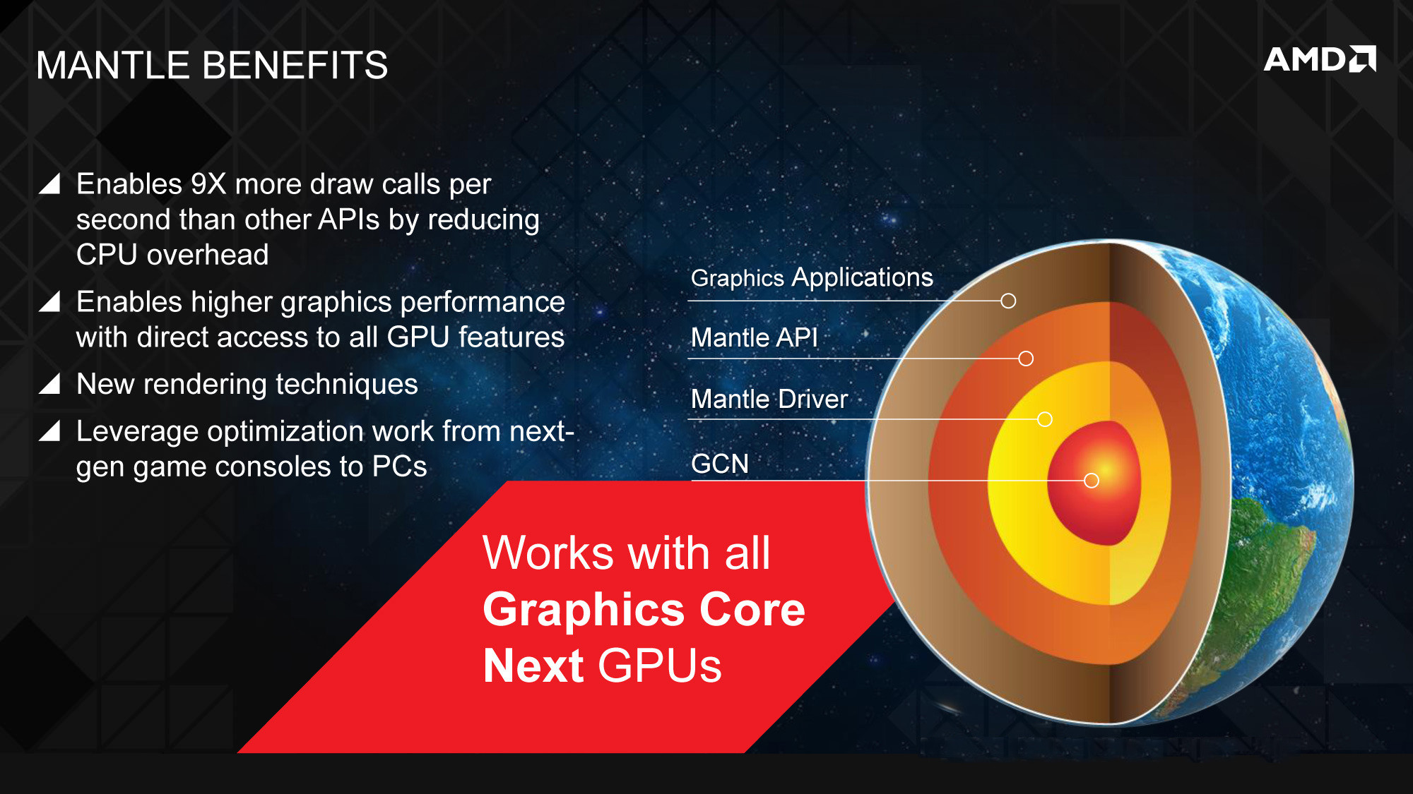 Особого внимания здесь заслуживает графический интерфейс API Mantle, позволяющий разработчикам стать ближе к «железу», получив доступ к аппаратным функциям Radeon и возможность устранять узкие места в процессоре. В умелых руках и при правильном сочетании центрального и графического процессоров частота кадров поднимается на недосягаемую высоту. Разработчики могут использовать Mantle и для увеличения производительности в многопроцессорных конфигурациях CrossFire, как это сделала компания Firaxis в игре Civilization: Beyond Earth.