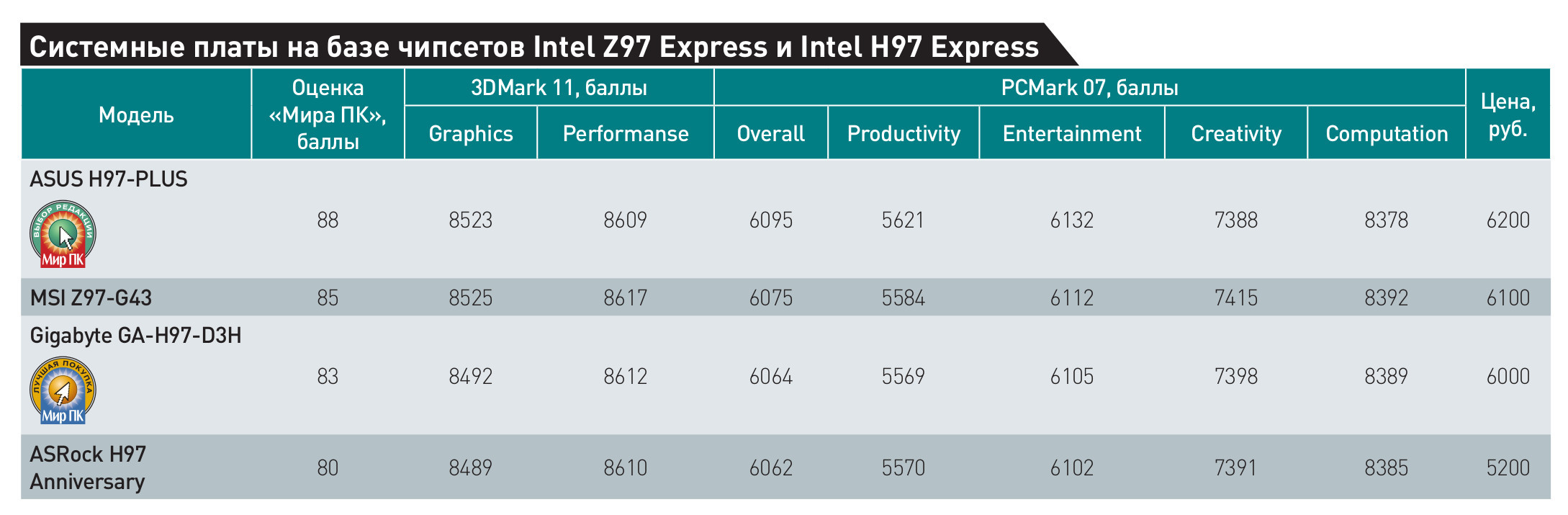 В результате подведения итогов в лидеры выбилась модель ASUS H97-PLUS, ставшая «Выбором редакции». А вот значок «Лучшая покупка» по праву получила плата Gigabyte GA-H97-D3H — на наш взгляд, она обладает неплохим набором функций при весьма привлекательной цене.