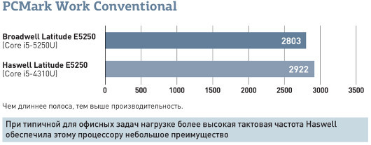Процессор Broadwell опережает Haswell по производительности на 5–10%. При этом мы сравнивали одинаковые модели процессоров, относящиеся к разным поколениям. Продолжительность работы от батареи у ноутбуков с чипом Broadwell примерно на 10% дольше. Производительность графики также заметно выросла, но мы по-прежнему имеем дело с интегрированной графикой, которая подходит для решения офисных задач и непритязательных игр.