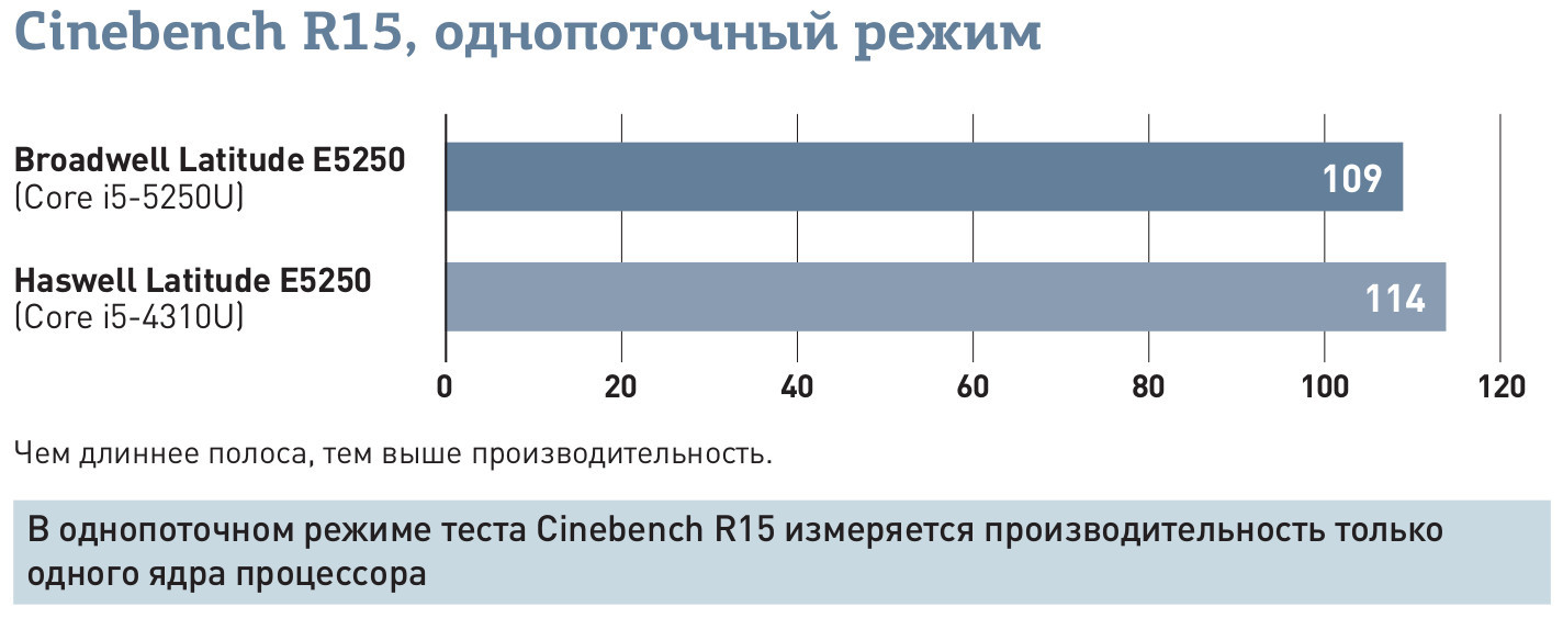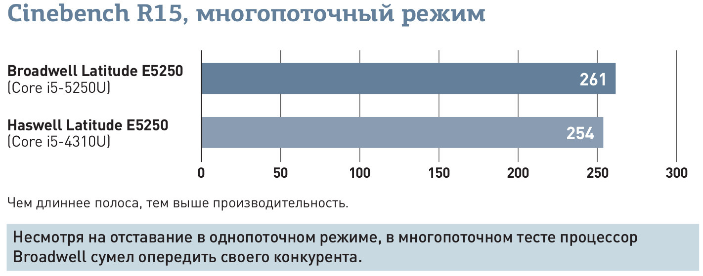 Хорошая новость для Broadwell заключалась в том, что разница в производительности оказалась меньше разницы в тактовой частоте. Если тактовая частота у двух чипов различалась примерно на 10%, то производительность при выполнении теста Cinebench R15 — всего на 5%.