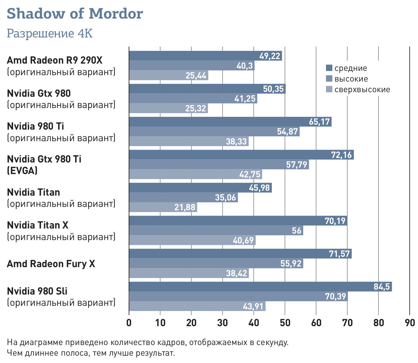 Начнем с Middle-earth: Shadow of Mordor. Эта игра получила множество отраслевых премий и, что еще важнее для нас, предлагает дополнительный набор текстур Ultra HD, который рекомендован лишь для плат, имеющих более 6 Гбайт памяти. И здесь Fury X немного обошла оригинальную GeForce GTX 980 Ti. Настоящий подвиг, если учесть, что игра открывается заставкой, описывающей достоинства непревзойденной технологии Nvidia.