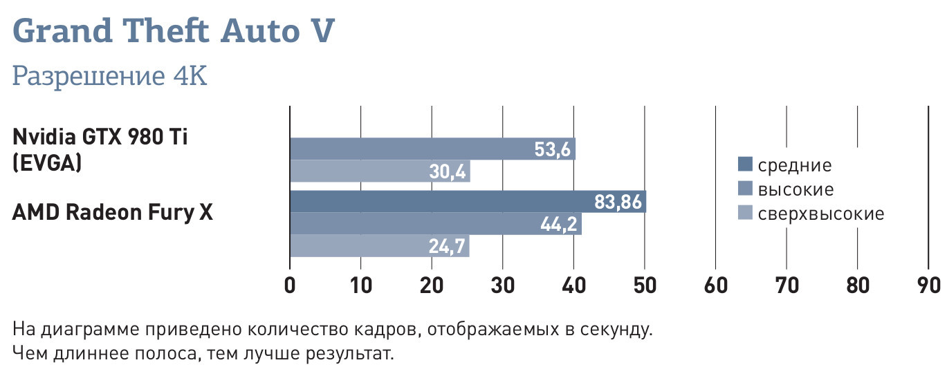 Платы Fury X и EVGA 980 Ti Superclocked+ тестировались также в игре Grand Theft Auto V, требующей более 4 Гбайт памяти (верхнее ограничение для HBM), при высоком разрешении.