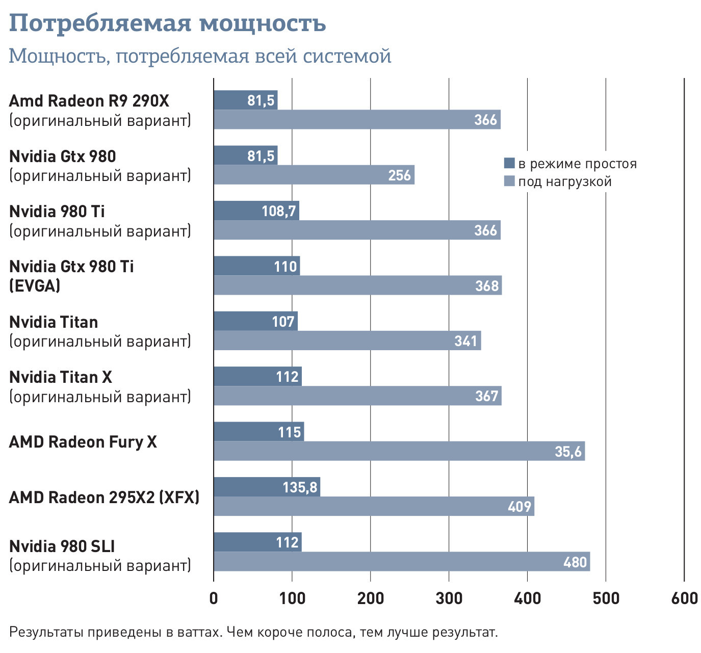 Возможно, Fury X и потребляет всего 275 Вт в «типичных игровых сценариях», как это утверждает AMD, но при использовании сценария Furmark ей требуется гораздо больше — почти столько же, сколько двум GTX 980 (не Ti) в конфигурации SLI. Эта плата потребляет даже больше энергии, чем двухпроцессорная Radeon 295x2.