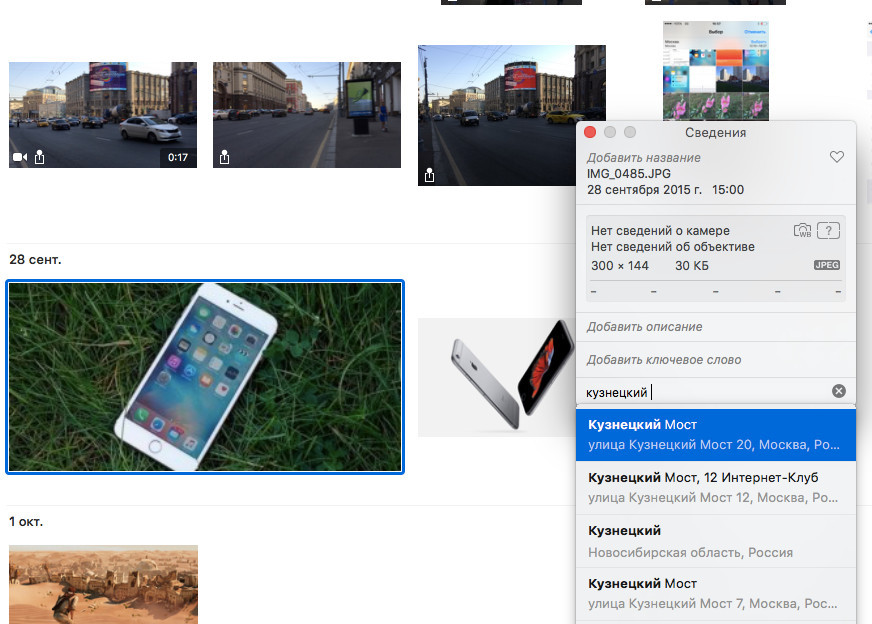 Чтобы проделать это, откройте окно Inspector. Для изображений, не снабженных геотегами, здесь предлагается раздел «Установить геопозицию». Щелкнув мышью на этой области, введите адрес или укажите название точки, которую «Фото» начнет искать в базе данных Apple Maps. Можно и просто перетащить значок привязки в нужное место на карте. Для изменения заголовков, описаний или ключевых слов в пакетном режиме пометьте нужные изображения и введите новую информацию в окне Inspector.