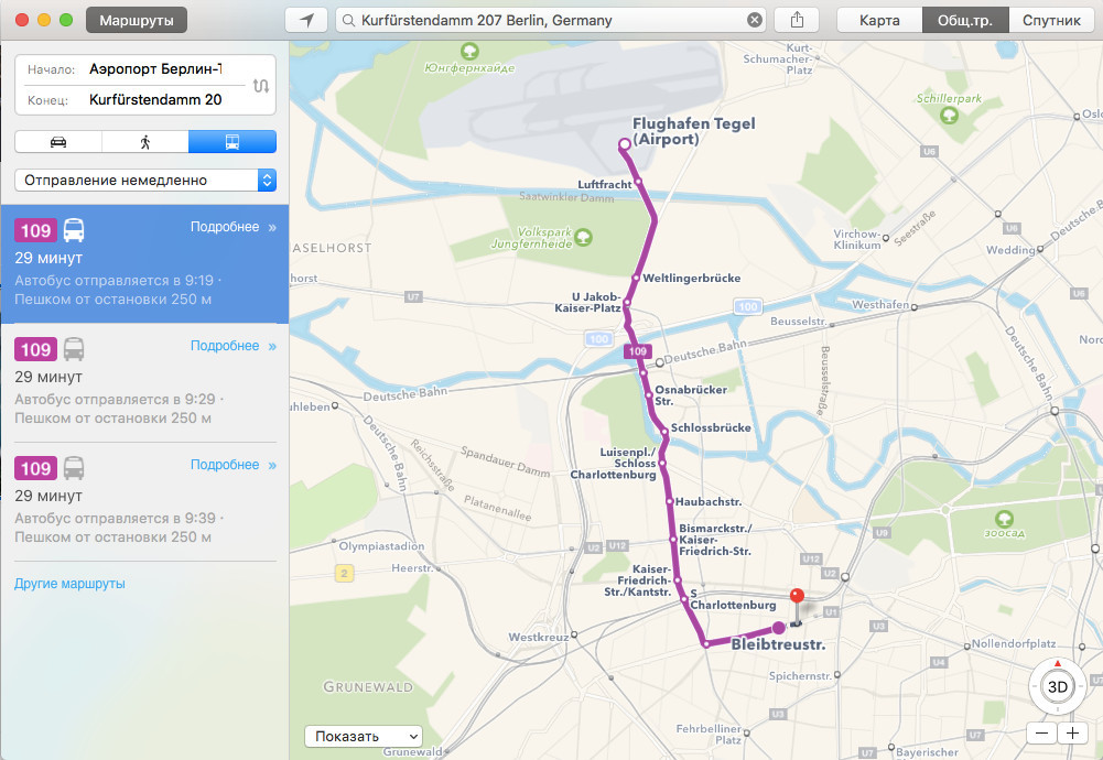 Одной из самых интересных функций «Карты» являются схемы маршрутов движения транспорта, которые поддерживаются для восьми североамериканских городов, двух европейских городов и более 300 городов Китая. Я попробовал воспользоваться этой функцией в районе залива Сан-Франциско и в Берлине, Германия. Должен признать, что это задача непростая, поскольку в этих городах действуют много транспортных агентств, не связанных друг с другом. Тем не менее мне удалось спланировать поездку от своей автобусной остановки до центра Беркли с пересадкой с автобуса на метро и точно рассчитать, когда следует выйти из дома, чтобы вовремя добраться до конечного пункта. Очень удобно. Теперь Apple осталось лишь распространить то же самое и на другие регионы.