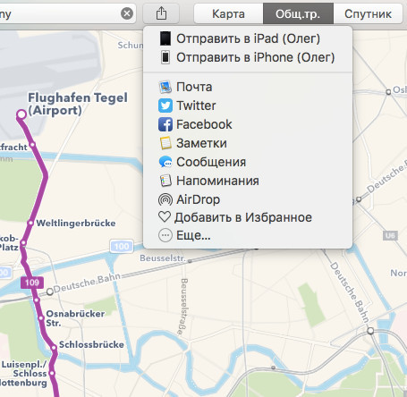 Планируя поездку, я обычно изучаю маршрут на Mac, а уже в дороге сверяюсь с картой на iPhone. В системе El Capitan информацией о маршрутах можно обмениваться с любым другим устройством iOS, подключенным к учетной записи Apple ID. Следовательно, я пересылаю свои маршруты на iPhone (и Apple Watch) парой щелчков мышью.