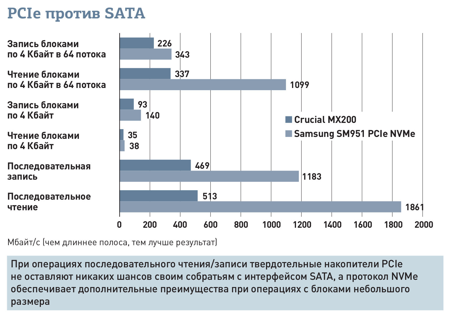 Почему? Дело в том, что пропускная способность шины SATA ограничена 600 Мбайт/с, чем и обусловлен переход на интерфейс M.2 PCIe. Объединение возможностей шины PCIe и твердотельных накопителей приведет к оснащению ПК сверхбыстрыми средствами хранения.